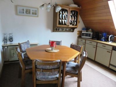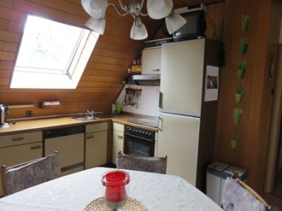 In der Küche befinden sich ein Esstisch mit 6 Stühlen, Kühlschrank,